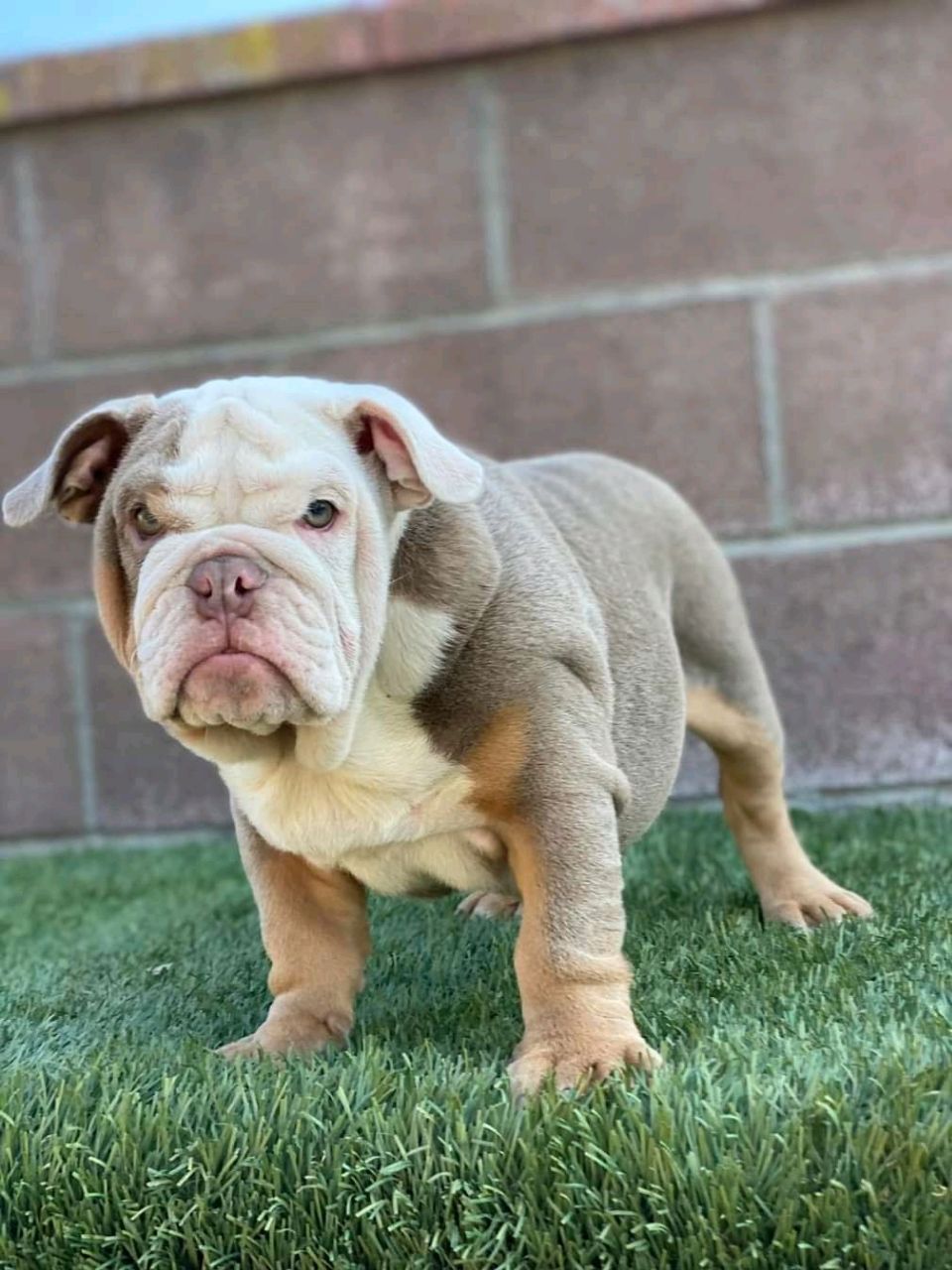 Meet Mardy, a stunning female English Bulldog who is ready to bring a lifetime of joy to your home! Mardy is a true beauty with a unique and elegant Chocolate, Cream, and White smooth-haired coat.