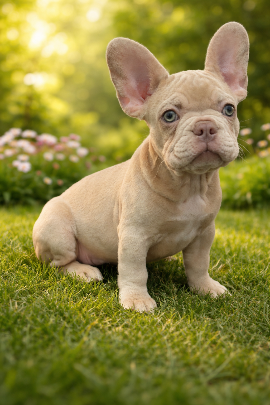 Meet Luna, a stunning Standard French Bulldog female who perfectly embodies the breed’s classic charm. With her beautiful Cream and Fawn smooth coat, she boasts a compact, sturdy build, a strong structure, and an excellent ear set that gives her that quintessential “Frenchie” look.